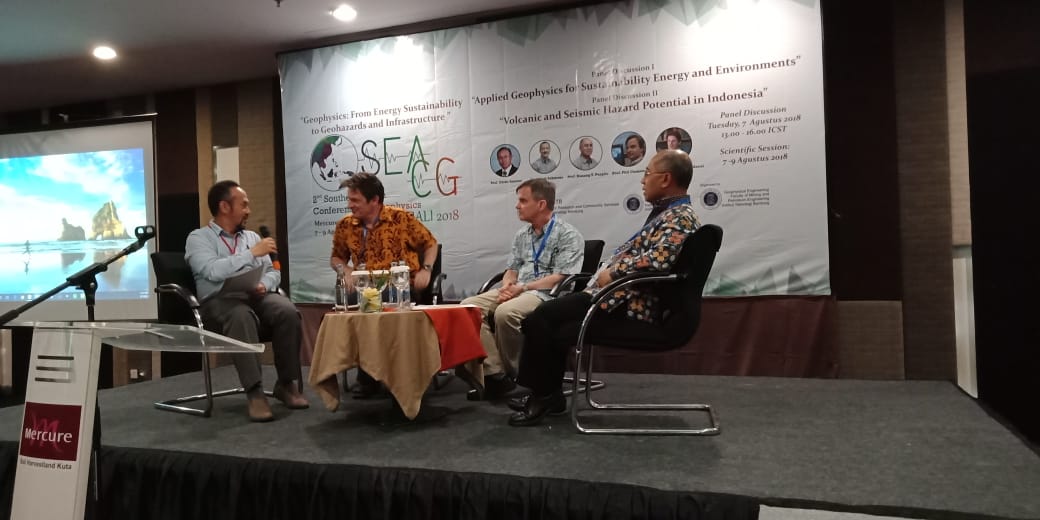 Selain sesi ilmiah, pada SEACG 2018 juga ada diskusi panel yang memunculkan dua tema yang sangat menarik dan kekinian. Tema pertama adalah Applied Geophysics for Sustainability Energy and Environments. Prof. Djoko Santoso (ITB) dan Prof. Sigit Sukmono (ITB) menjadi pembicara kunci pada sesi ini.