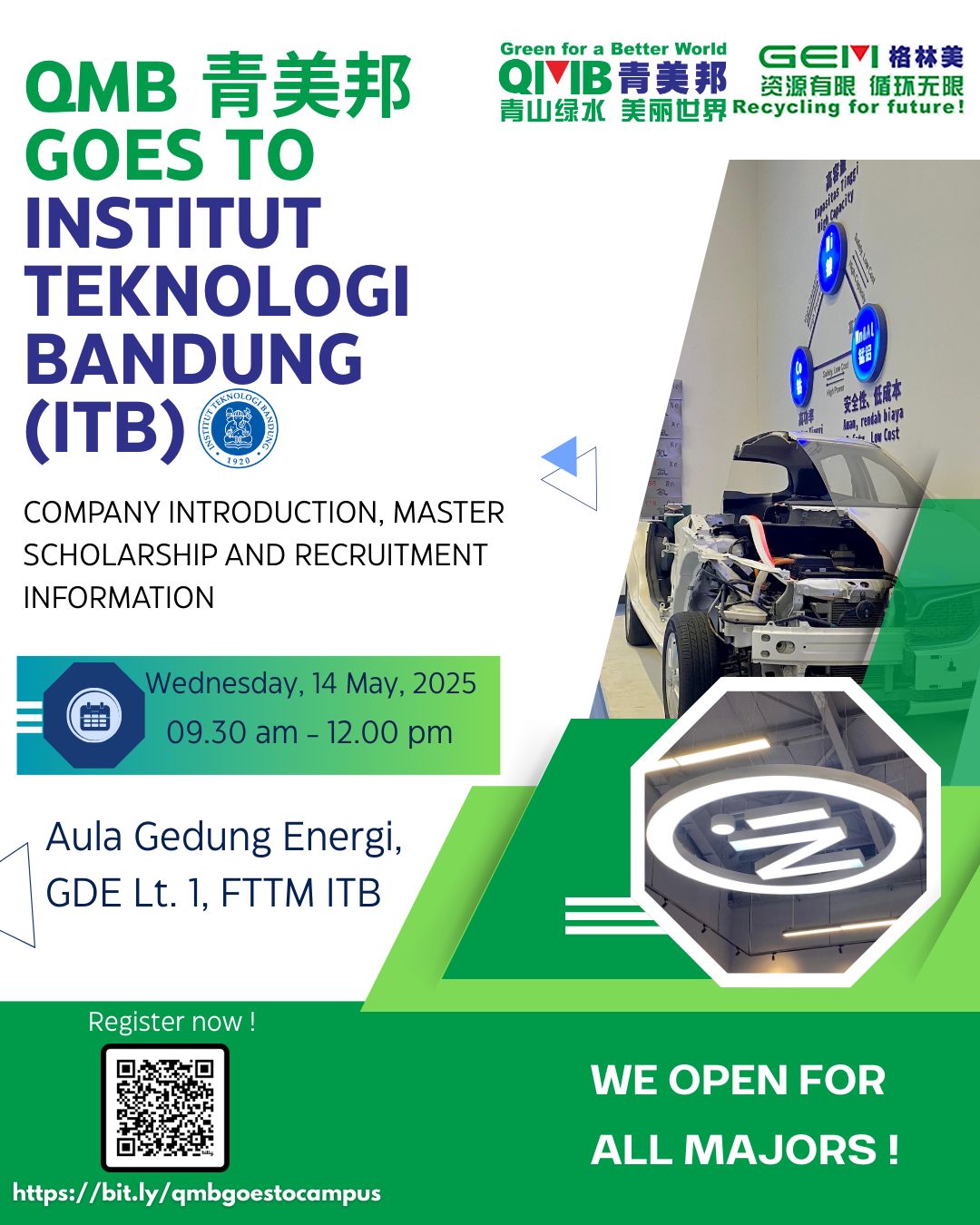 Bandung, 14 Mei 2025 – QMB (青美邦) mengadakan acara QMB Goes to Institut Teknologi Bandung (ITB) pada hari Rabu, 14 Mei 2025, yang berlangsung di Aula Gedung Energi, GDE Lt. 1, FTTM ITB, dari pukul 09.30 WIB hingga 12.00 WIB. Acara ini menyajikan berbagai informasi terkait perusahaan, kesempatan beasiswa S2, serta peluang rekrutmen bagi para […]