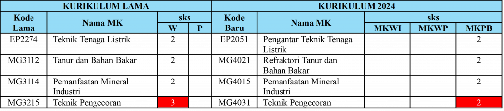 - Mahasiswa angkatan 2022, 2021, dan sebelumnya yang telah lulus / akan menyelesaikan mata kuliah MG4211 K3 dan Lingkungan Metalurgi dapat menggunakannya untuk proses ekivalensi ke mata kuliah MG4211 K3 dan Lingkungan Metalurgi (2 sks) dan mata kuliah WI1103 Pengantar Prinsip Keberlanjutan (2 sks) di kurikulum 2024.
